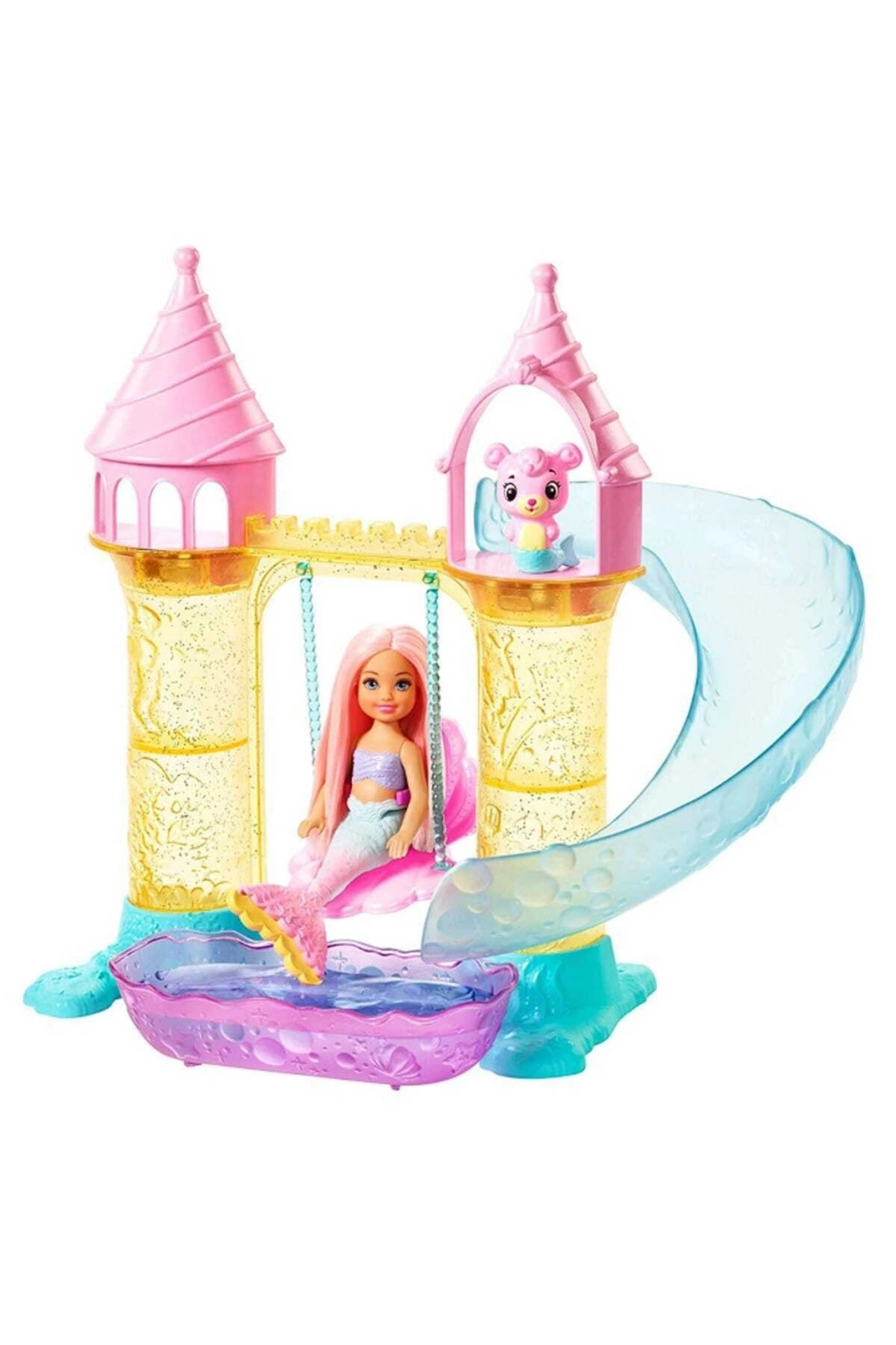 Barbie Dreamtopia Denizkızı Chelsea ve Şatosu Oyun Seti FXT20-FXT20 Chelsea™ denizkızı bebek ve arkadaşı Merbear ayıcık, her moda uygun olağanüstü sürprizler sunan oyun setiyle oyuna dalmaya hazır! Pastel pembe, mavi ve sarı renkli kum kalesi şeklindeki oyun setinde bir salıncak, kaydırak, havuz ve iki kişilik çay partisi servisi bulunur. Chelsea™ bebeği pembe, deniz kabuğu şekilli salıncağa takıp ileri geri salla ve Merbearı kaydıraktan kaydırarak kuleden havuza gönder. Gerçek su sıçratma etkisi için havuzu suyla doldur. Çocuklar ayrıca suda oyun eğlencesini ikiye katlamak için Merbearı suyla doldurup püskürtme oyuncağı olarak da kullanabilir. Çay vakti geldiğinde Chelsea™ denizkızı bebek ve Merbear iki sandalyeyi masaya çekip kendi kupa ve çay tabaklarıyla bir fincan çayın keyfini çıkarabilir. Kızlar favori sahnelerini ve peri masalı hayallerini canlandırmaya bayılacak. Barbie® ve Chelsea™ ile Dreamtopia Hayaller Ülkesine adım attığında, hayallerin gerçek olduğu bir dünyaya ulaşırsın. Tüm Barbie™ Dreamtopia bebeklerini ve oyuncaklarını (Her biri ayrı olarak satılır ve stoklarla sınırlıdır) topla ve hayaller dünyasına açıl. Ürün Chelsea™ denizkızı bebek, Merbear püskürtme oyuncağı, kum kalesi oyun seti ile salıncak ve kaydırak, havuz, masa, iki sandalye ve çay tabaklı iki çay bardağı içerir. Bebek tek başına ayakta duramaz ve yüzemez. Renkler ve süslemeler çeşitlilik gösterebilir. Eğlence dolu kum kalesi oyun setine sahip Chelsea™ denizkızı bebek ve arkadaşı Merbear ile kendini oyunun eğlencesine bırak! Havuzu suyla doldur ve su sıçratmak için Merbearı kaydıraktan kaydır. Sonra havuzu suyla doldur ve Merbearı püskürtme oyuncağı olarak kullanıp arkadaşlarını şaşırt! Chelsea™ bebeği pembe deniz kabuğu şekilli salıncağa yerleştir ve salla. Tabii, uçurmamaya dikkat ederek! Plaj masasında iki kişilik çay partisi ver. İki adet mor renkli ve deniz kabuğu sırtlı sandalye ve çay tabaklı iki bardakla çay partisinin keyfini çıkar. Kızları memnun edecek çok sayıda eğlenceli sürprizler içeren bu Chelsea™ Oyun Seti; özellikle denizkızlarını, hayallere kapılmayı ve peri masallarını seven çocuklar için harika bir hediyedir.