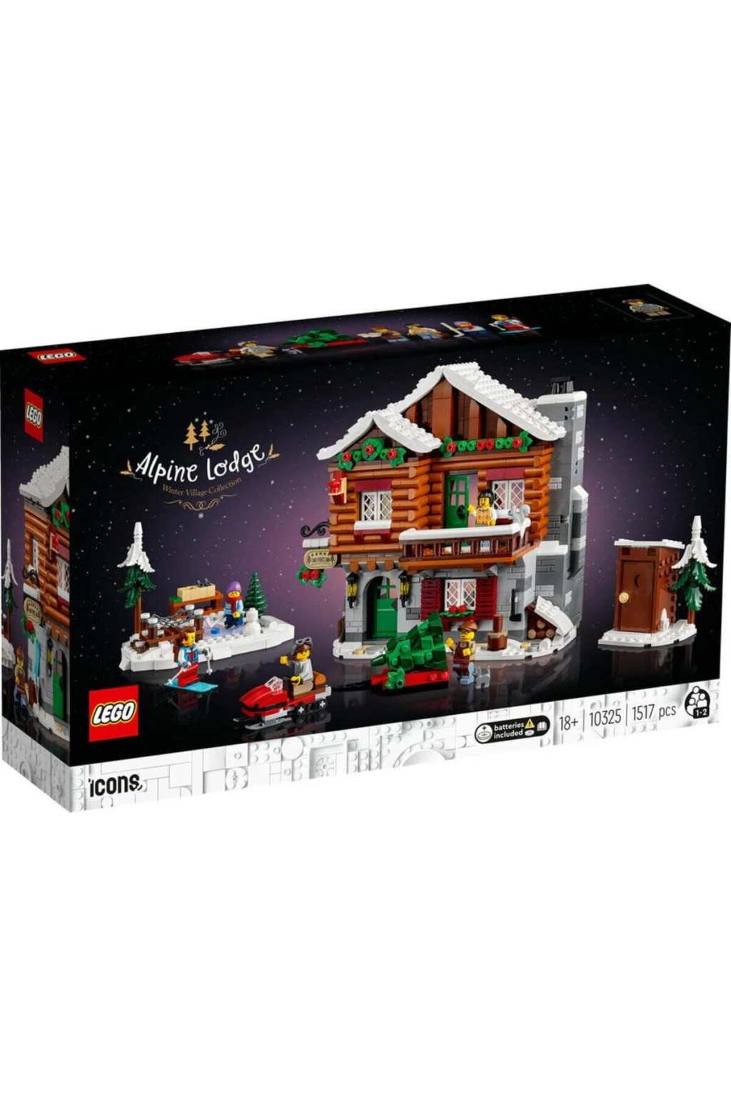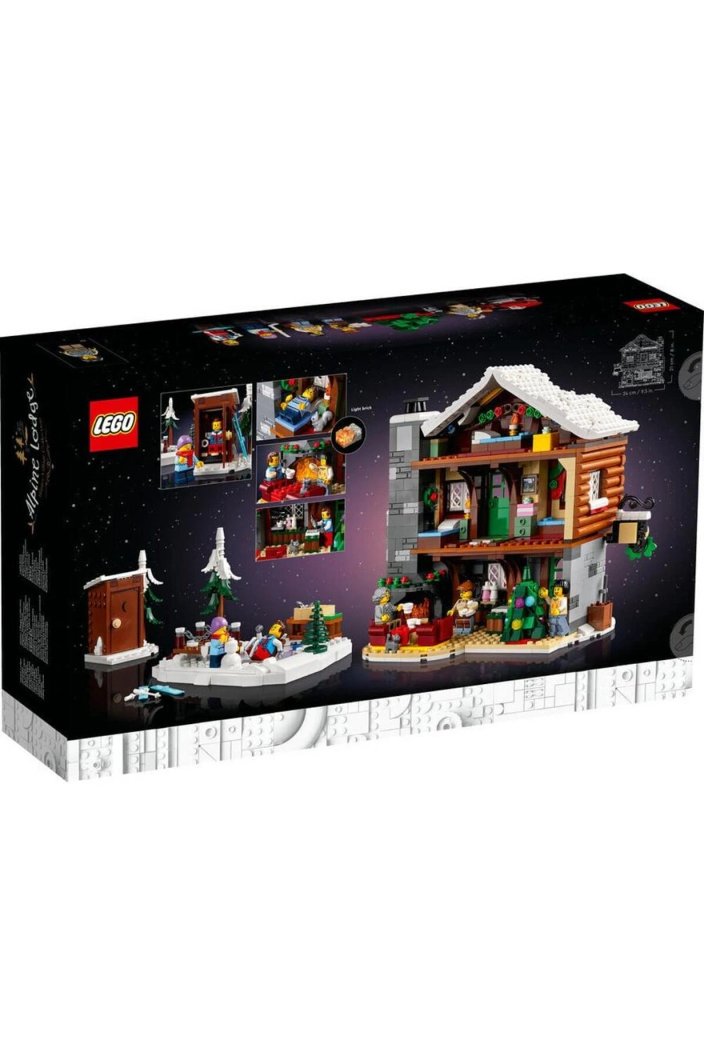 LEGO Icons 10325 Alpine Lodge (1517 Parça) Popüler LEGO Kış Köyü Koleksiyonu’nun en yeni üyesi LEGO® Icons Alp Kabini’ne (10325) hoş geldiniz.; Rahat misafir odaları ve ışıldayan şömineleriyle sıcak, tepesi karlı bir pansiyon inşa etmeye vakit ayırın.; Şahane detaylar 3 katlı kabin modelinde resepsiyon masası, ışıklı şömine ve kahve makinesi olan dayalı döşeli bir resepsiyon odası, ikinci katta ışıklı şöminesi ve 2 yatağı olan bir misafir odası ve üçüncü katta bir çatı odası bulunur.; Dışarıda odunluk, kayak kutusu, paten alanı ve tuvalet kabini, ayrıca motorlu kızak, yılbaşı ağacı, 5 minifigür ile birlikte kuş, kedi ve sincap figürleri vardır.; Ailece yılbaşı modeli Çocuklar ve yetişkinler için ayrı yapım talimatlarına sahip LEGO Kış Köyü koleksiyonunun hayranları için mükemmel bir hediye fikri olan bu birinci kalite LEGO setiyle bir dinlenme alanını keşfedin.; Ailece yılbaşı temalı bir yapım projesi – LEGO® Icons Alp Kabini’nin (10325) tüm detaylarını yaparken kaliteli zaman geçirin; Kutuda ne var? – 3 katlı alp kabini, paten alanı, tuvalet kabini, motorlu kızak ve römork, ayrıca bir yılbaşı ağacı, 5 minifigür, kedi, sincap ve kuş figürleri inşa etmek için ihtiyacınız olan her şey; Özellikler ve fonksiyonlar – Resepsiyon ve ikinci kattaki misafir odasında bulunan şömineleri aydınlatmak için bacaya basın; LEGO® hediyesi – Bu yapım setini LEGO yapım setlerinin ve LEGO Kış Köyü koleksiyonunun yetişkin hayranlarına doğum gününde, yılbaşında ya da herhangi bir zamanda hediye edin; Boyutlar – Kabinin yüksekliği 21 cm, genişliği 24 cm, derinliği 16 cm’dir; Aksesuarlar – Sette bir yılbaşı ağacı, ağaç süsleri ve misafir defteri bulunur.