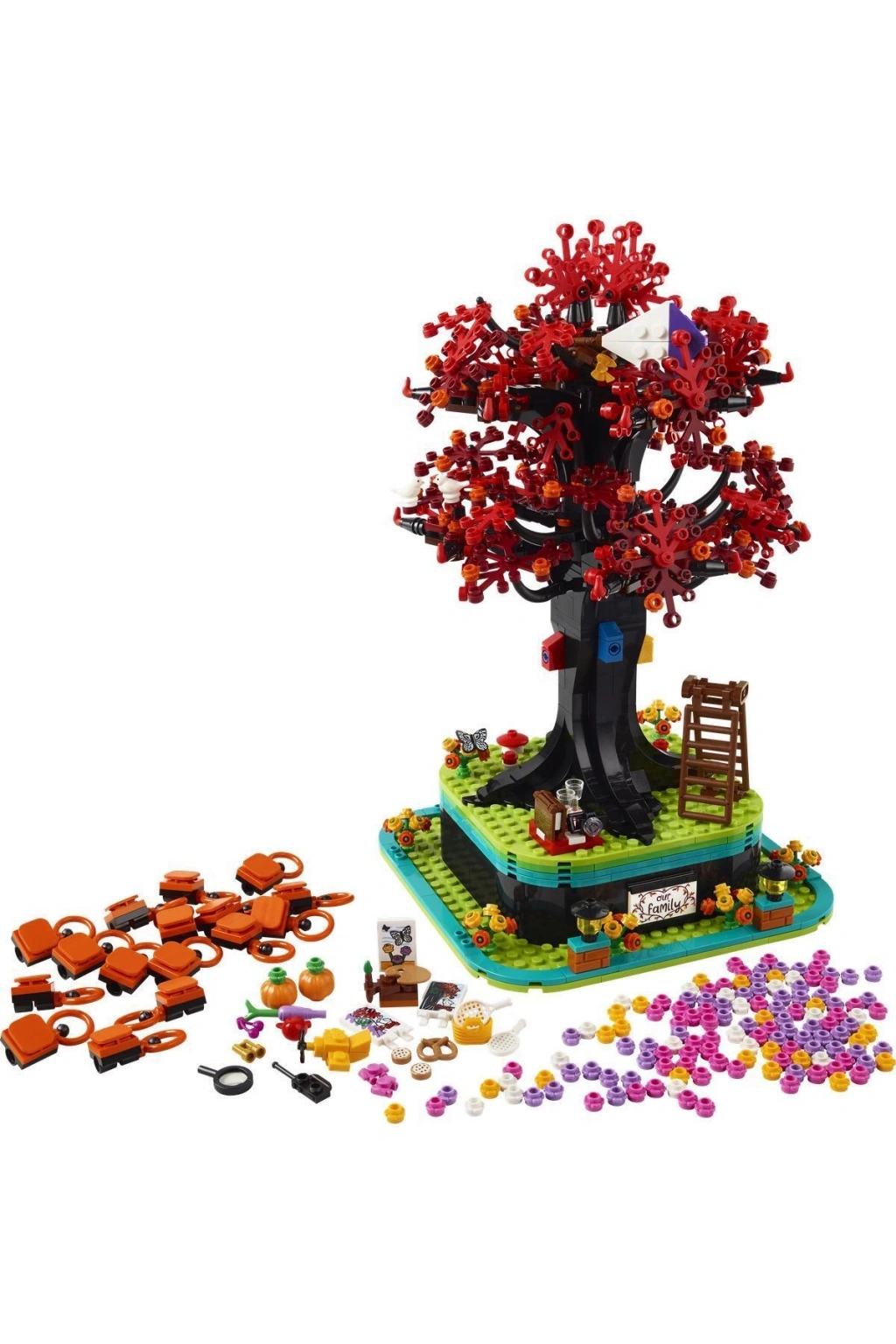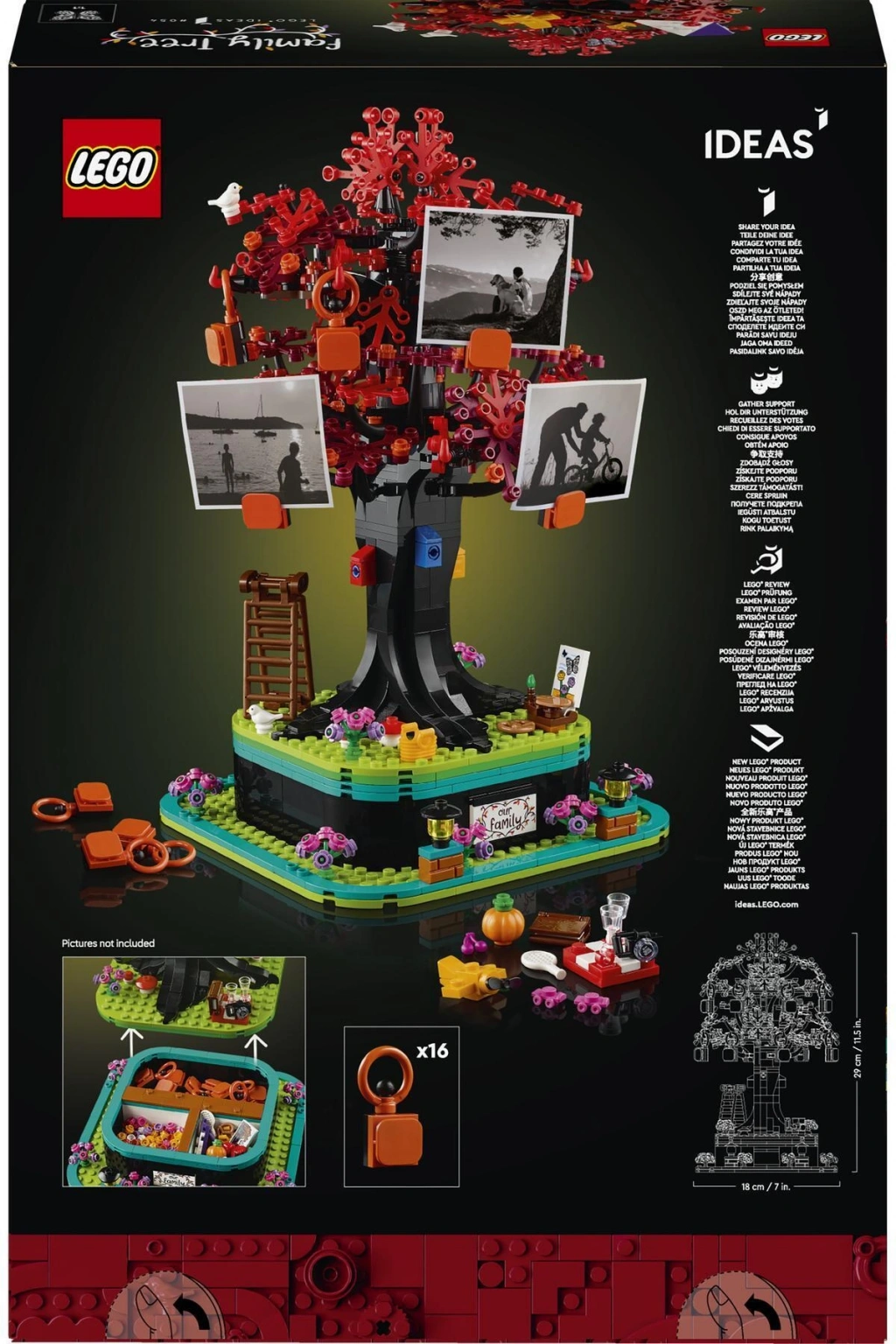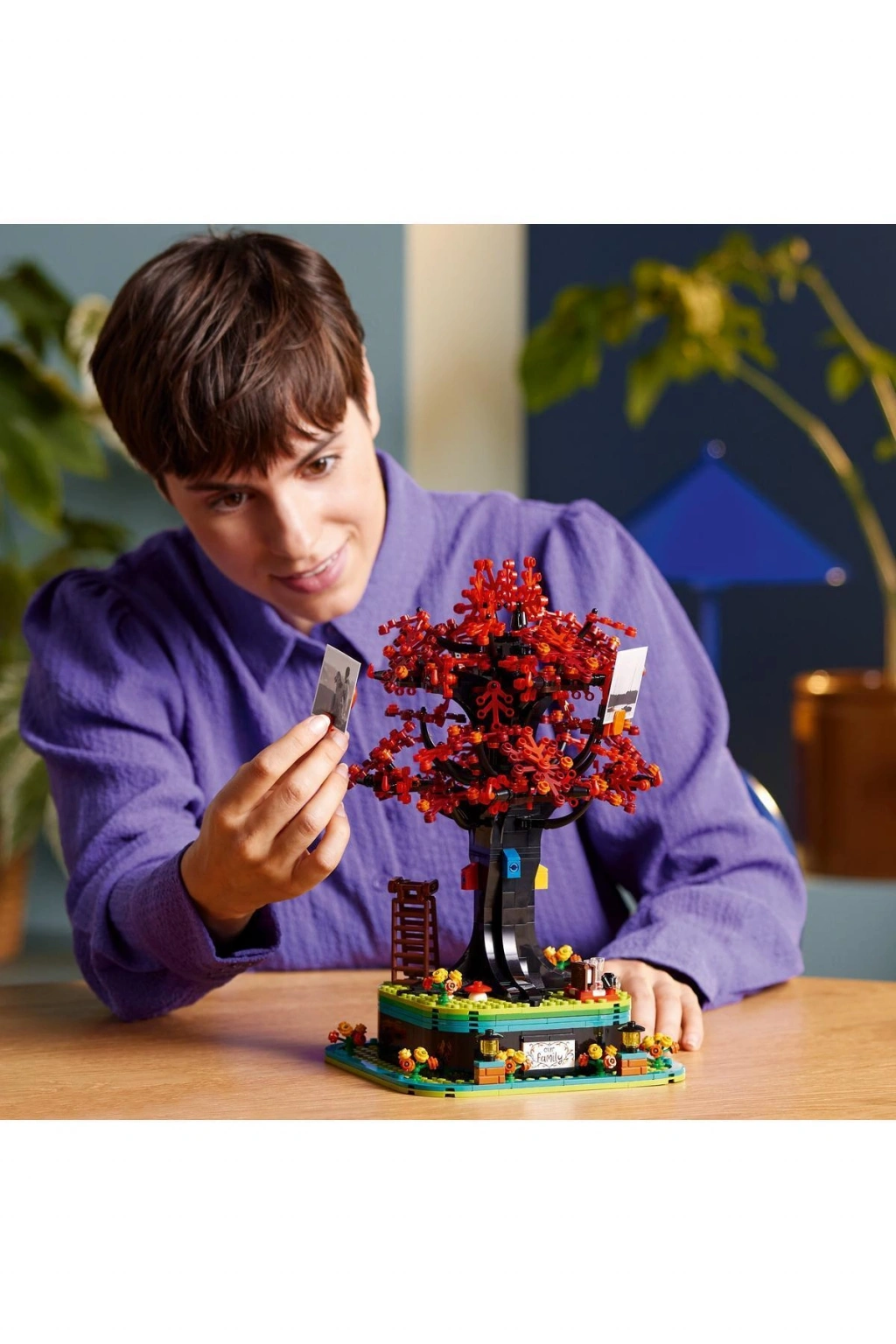 LEGO® Ideas Aile Ağacı (21346) süsünü birlikte inşa edin, nostaljik anıları canlandırın ve benzersiz bir dekoratif eşya yapın. Yetişkinler için harika bir hediye olan bu inşa edilebilen aile ağacı standındaki 16 askıda küçük fotoğraflar, mesajlar ve başka kağıt anılar sergileyebilirsiniz.;Ağacın tabanındaki gizli saklama bölmesi, aksesuarlarla doludur. Mevsimlik yapraklar arasından seçim yapın, ağacın dallarına oyuncak bir uçak ve uçurtma yerleştirin ve 4 kuş evini, 2 kuş figürünü ve bir Filipin kelebeğini ekleyin. Ayrıca çimen renkli zemine koymak için çiçekler ve bu huzurlu sahneyi kişiselleştirmek için dürbün, yiyecek, paten ve büyüteç gibi pek çok başka eşya seçeneği var.;Aileniz ve arkadaşlarınızla bu farkındalık yaratan ve dinlendirici aktivitenin keyfini çıkarmanıza yardımcı olacak adım adım yapım talimatlarını kutuda ve LEGO Builder uygulamasında bulabilirsiniz.