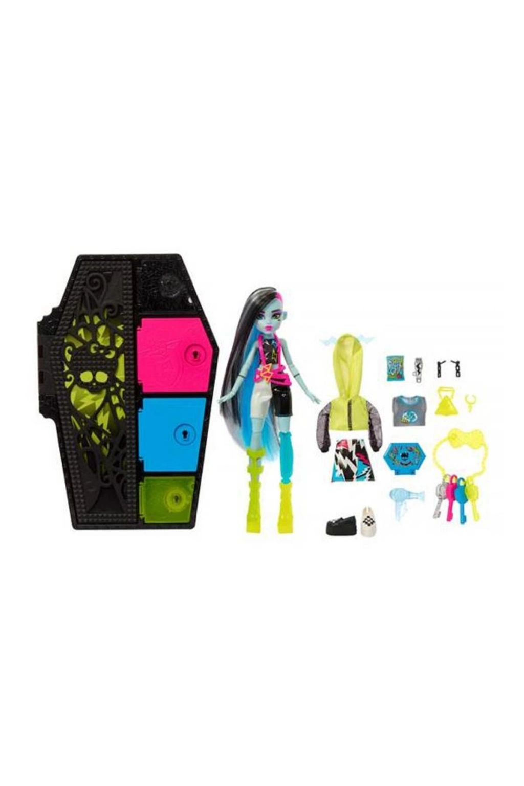 Monster High Neon Frights Bebek Frankie Stein HNF794 yaş ve üzeri çocuklar için uygundur.; Elektrik rengindeki her set, bir Monster High bebeği ve karanlıkta parlayan üç aksesuar dahil 19'dan fazla sürprizle birlikte gelir.; Renk Gösterimi büyüsü ve adım adım açılış, muhteşem bir kutu açma deneyimi sağlarken tabut şeklindeki dolap, hikaye anlatımı ve depolama için mükemmeldir.; Bebeğinin dolabını açın.; Bir sır verebilir misin? Dört Color Reveal anahtarını alın ve gizemli kaplamalarını yıkayın, ardından içlerine saklanan gizli eşyaları bulmak için eşleşen dört bölmenin kilidini açın.; Karanlıkta parlayan üç aksesuarı keşfetmek için ışıkları kapatın! En karanlık geceleri bile aydınlatacak kıyafetler yaratmak için bunları birlikte verilen diğer stil parçalarıyla karıştırıp eşleştirin.; Bebeklerin her biri iki tam kıyafet, iki çift ayakkabı, çeşitli aksesuarlar ve bölmelerin kilidini açmak için bir dizi renk değiştiren anahtarla birlikte gelir.; Bebekler tek başına ayakta durmaz.; Kutu ölçüsü: 32 x 21x 7 cm